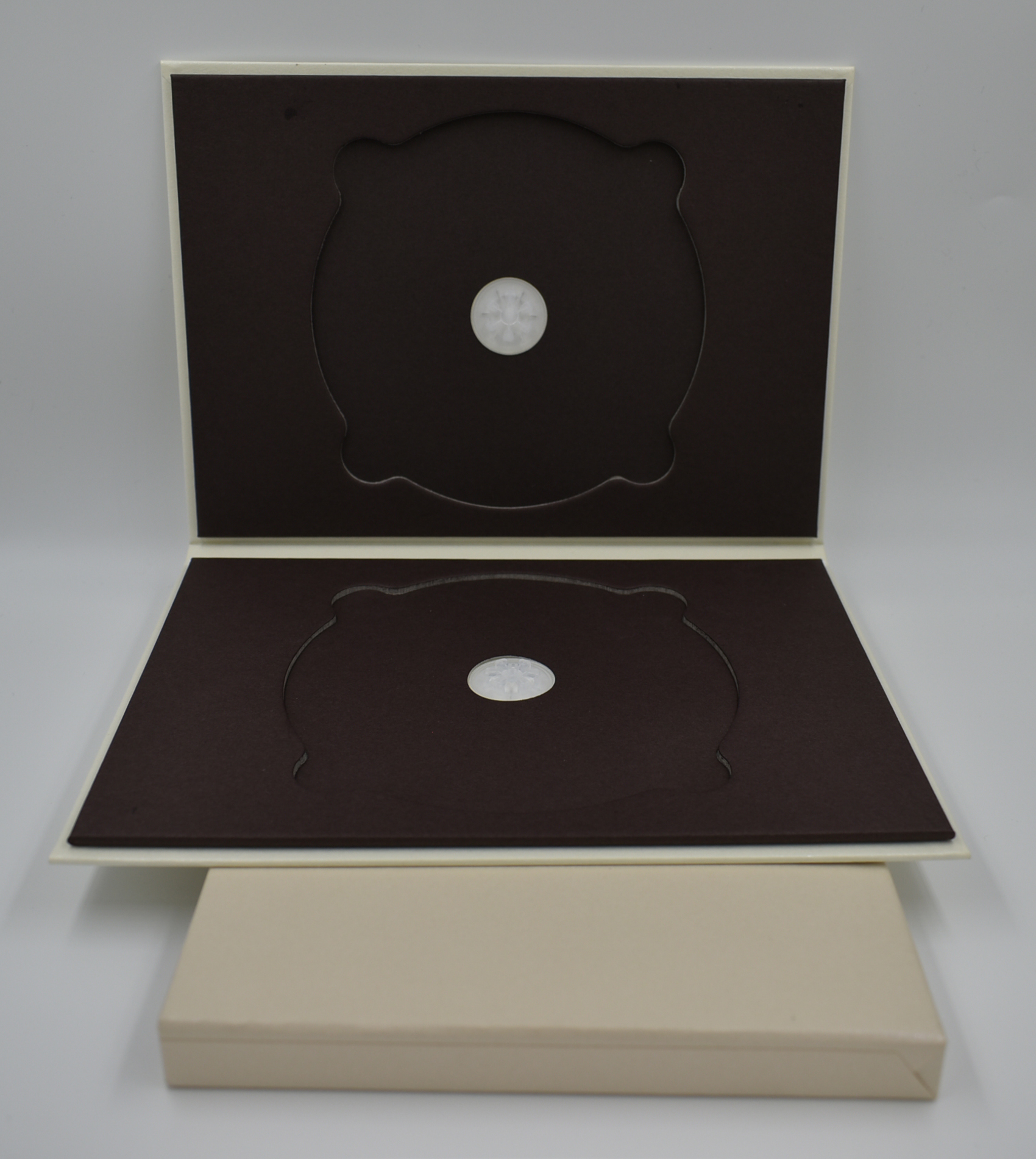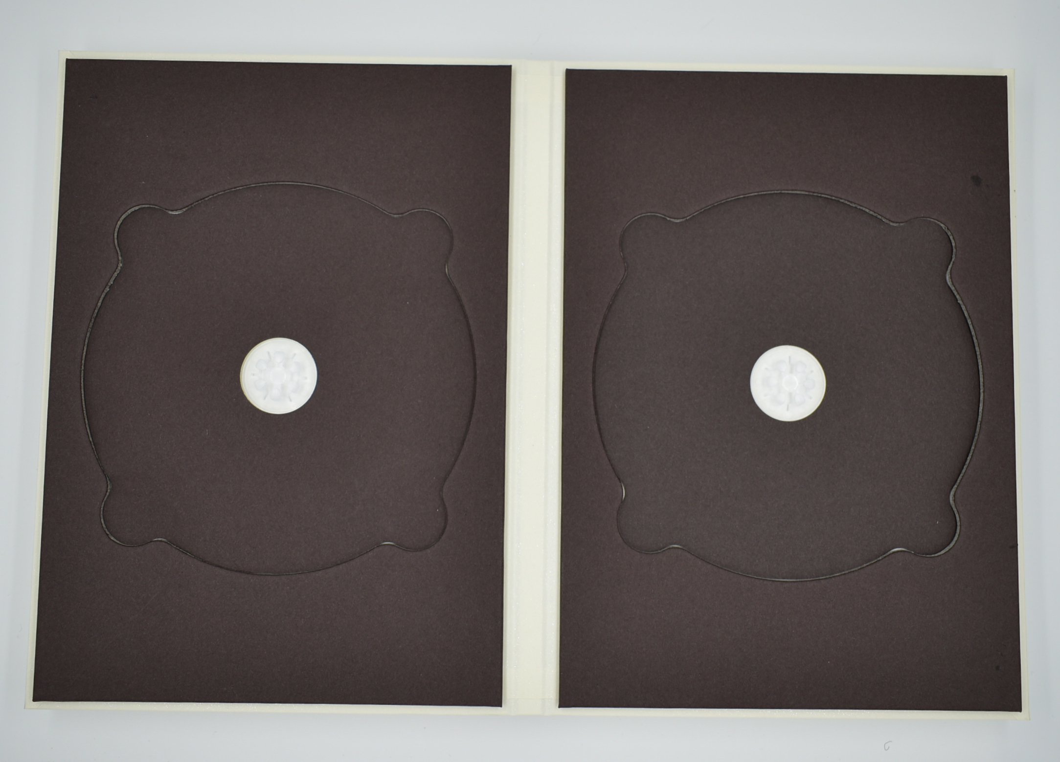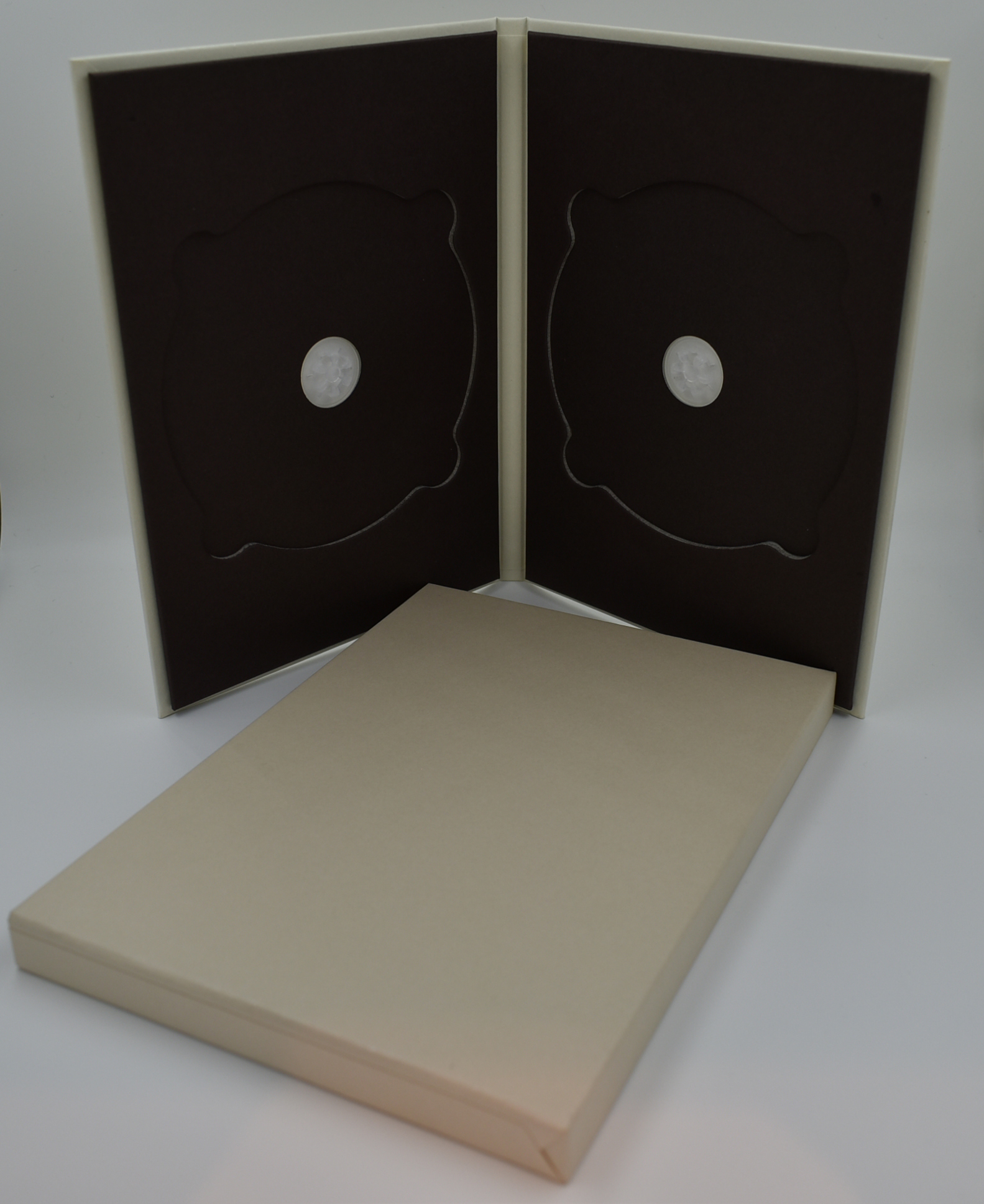2ディスク紙トレイ&三方背ケース ディスクは150mm(ヨコ)×208mm(タテ)×6mm(厚み)のデジトレイ型ですが、デジトレイとは違いトレイ部分が紙で出来ております。2ディスク収納可能でCD2枚を入れてもいいですいDVD/BDなどを組み合わせて収納のOK。 三方背ケースは印刷した紙で厚紙を包み厚さがあり、しっかりとした重厚感が出ております。 154mm(ヨコ)×214mm(タテ)×16mm(厚み)のサイズでトールケースより一回り大きいですが、ガッチリとした質感が豪華さを演出しています。