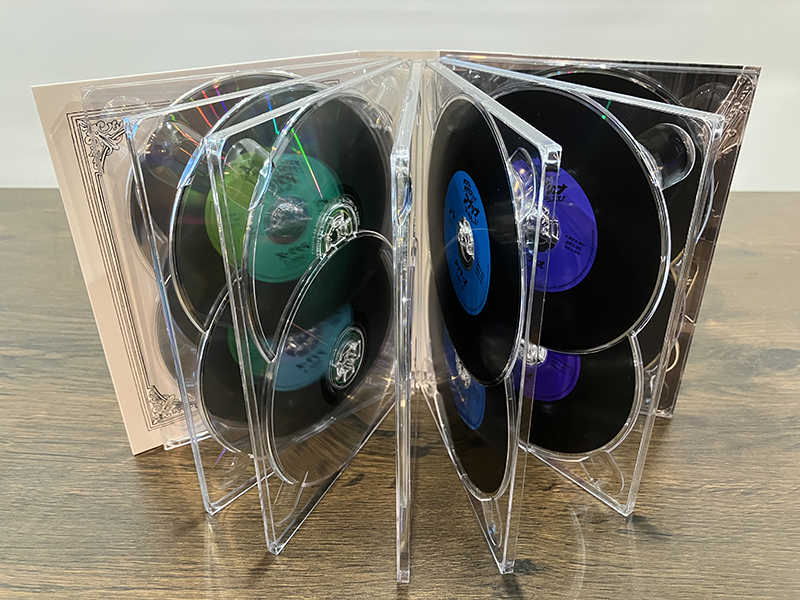 DVデジスタック2面ツイントレイ14枚組、透明三方背ケース&16ブックレット ツインデジトレイを7枚重ねた14枚組デジスタックです。透明三方背ケースに収納して表面のデザインをしっかり活かした仕様になっています。16Pブックレットにはアーティストの思い出の写真と共に収録曲が書かれています。 まさにアーティスト活動の集大成などに相応しい仕様になっております。