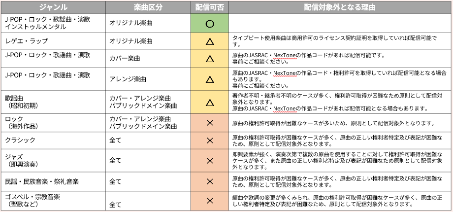 「配信可否」「✕」となる楽曲は、弊社でデジタル音楽配信サービスのお申込みをお受けすることが出来ません。