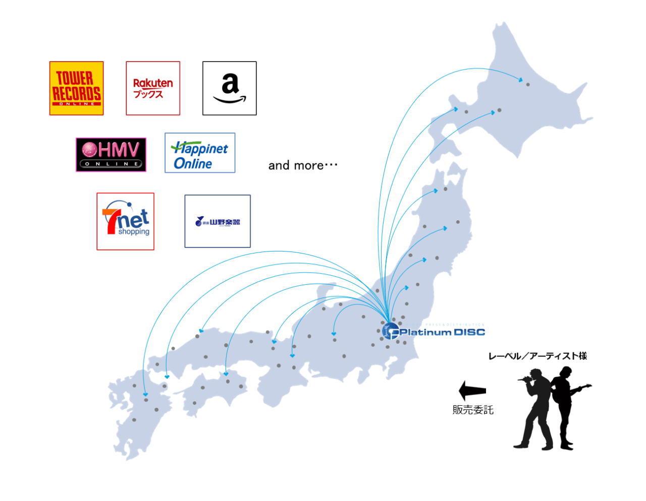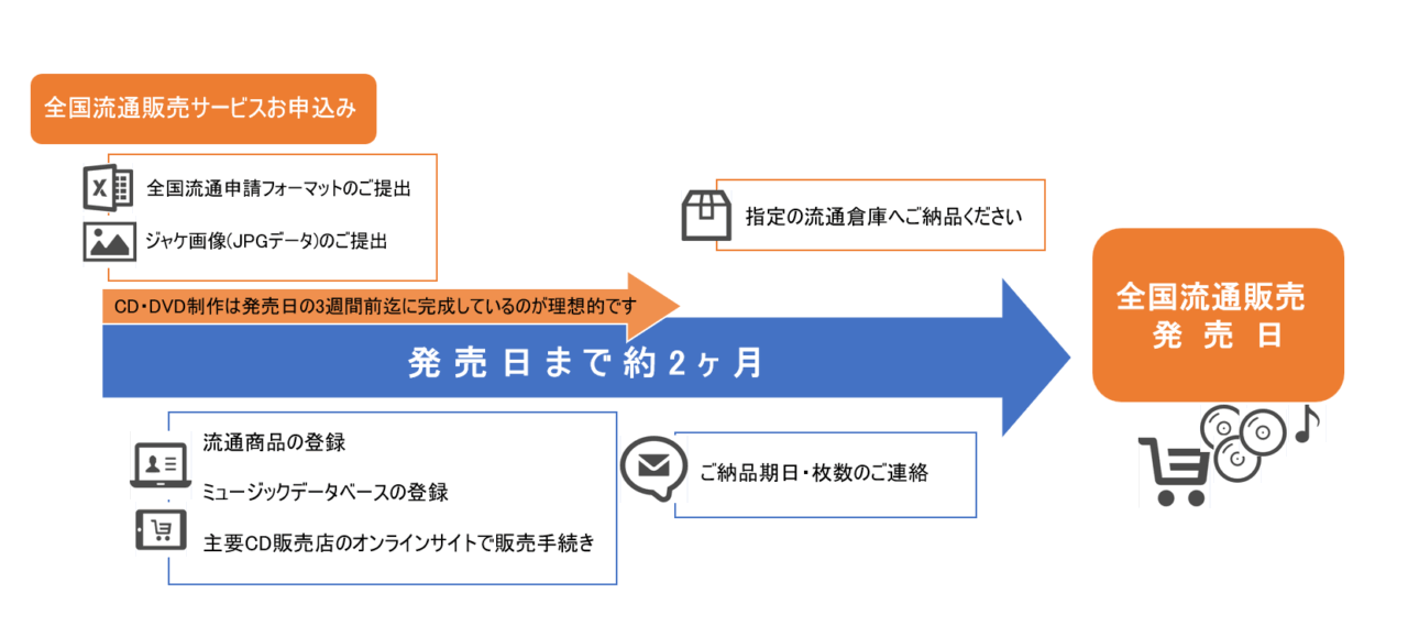 あなたの作ったCDやDVDが大手ディストリビューターを通じてCD専門店オンラインサイト[タワーレコード・ローソンHMV・ディスクユニオンなど]やECサイト[Amazon・楽天ブックスなど]で販売が可能になります。